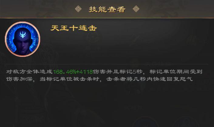 郭嘉对敌方全体造成168.46%加上4118点伤害,并附加持续5秒的标记效果。在标记期间,目标受到的伤害会加深。若被标记的单位被击杀,击杀者将在数秒内快速恢复怒气,且该效果随技能等级提升而增强。