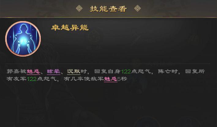 郭嘉被控制时回复122怒气,阵亡时为全体友军恢复122怒气,并有概率使敌人陷入魅惑状态,持续5秒,效果随技能等级提升。