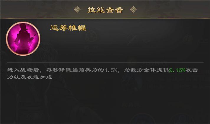 郭嘉上场后,每秒损失当前兵力1.5%,同时为我方全体提升9.16%攻击力与攻击速度,效果随技能等级增强。