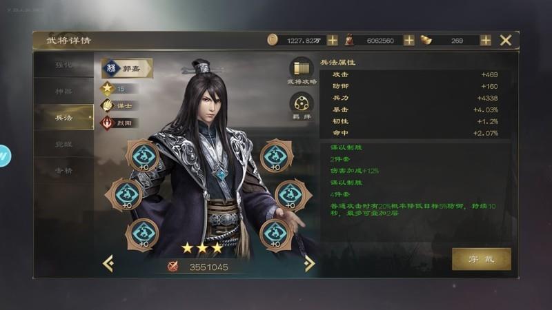 郭嘉的统帅属性在基础三维中较为突出,智谋属性在计策型武将中也处于较高水平,唯有武力偏低。因此,他在面对战法攻击时稍显脆弱,但在物理与计策防御方面表现尚可。
