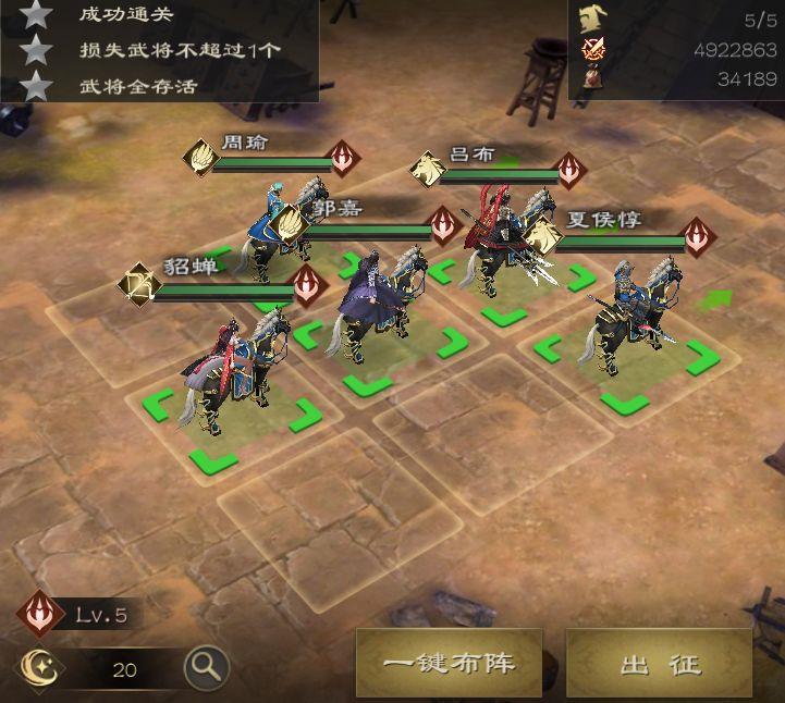 这套阵容核心由郭嘉、吕布与夏侯惇组成。郭嘉可为队伍提供加成,配合夏侯惇的群体伤害技能及吕布的多段攻击技能,能在一回合内打出爆发性输出。貂蝉作为治疗型武将,提升队伍整体的持续作战能力。而曹操则凭借自身兵力回复效果,充当辅助输出的角色。