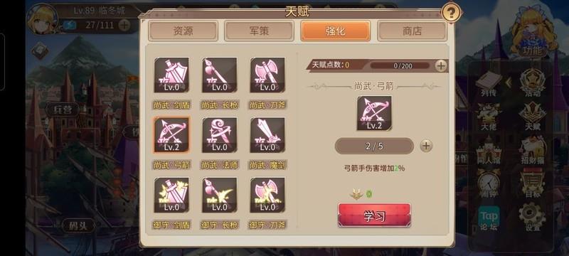 尚武·弓箭:前期推图清敌便捷,非必需技能可不升级。