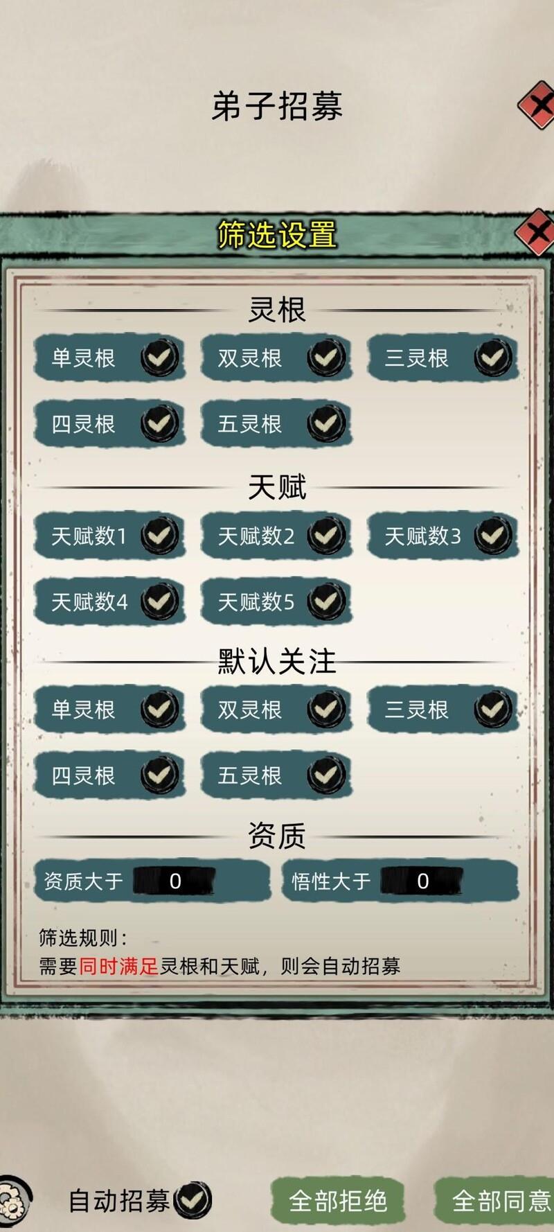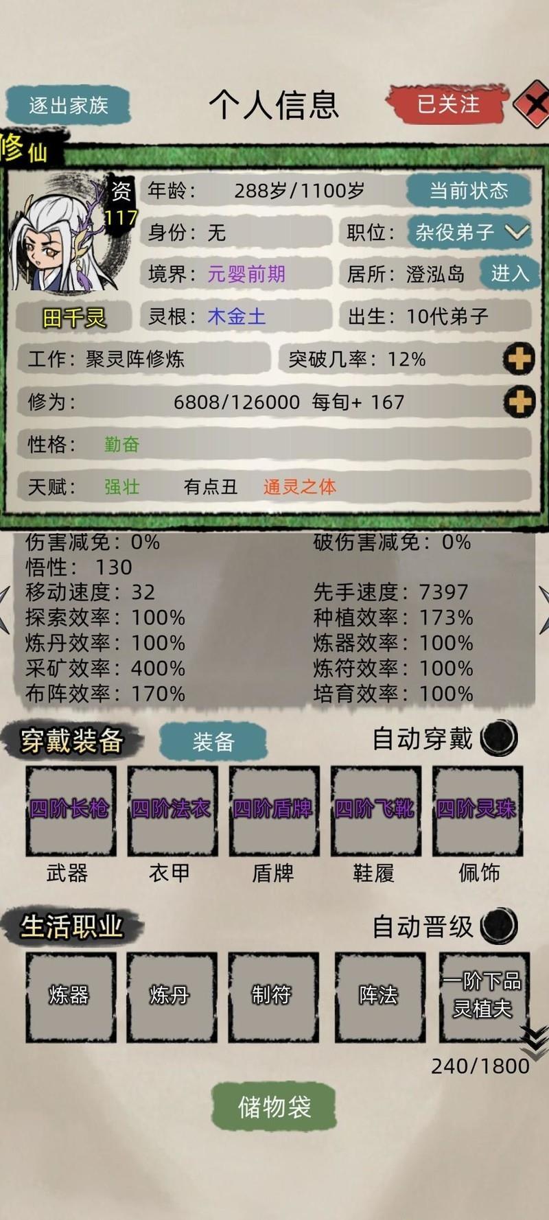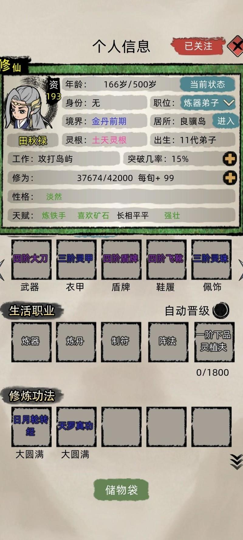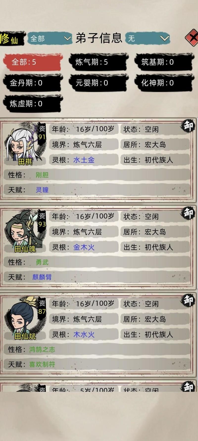 按教程正常游戏,来者不拒招收弟子,用灵石为弟子购置全套绿色装备。