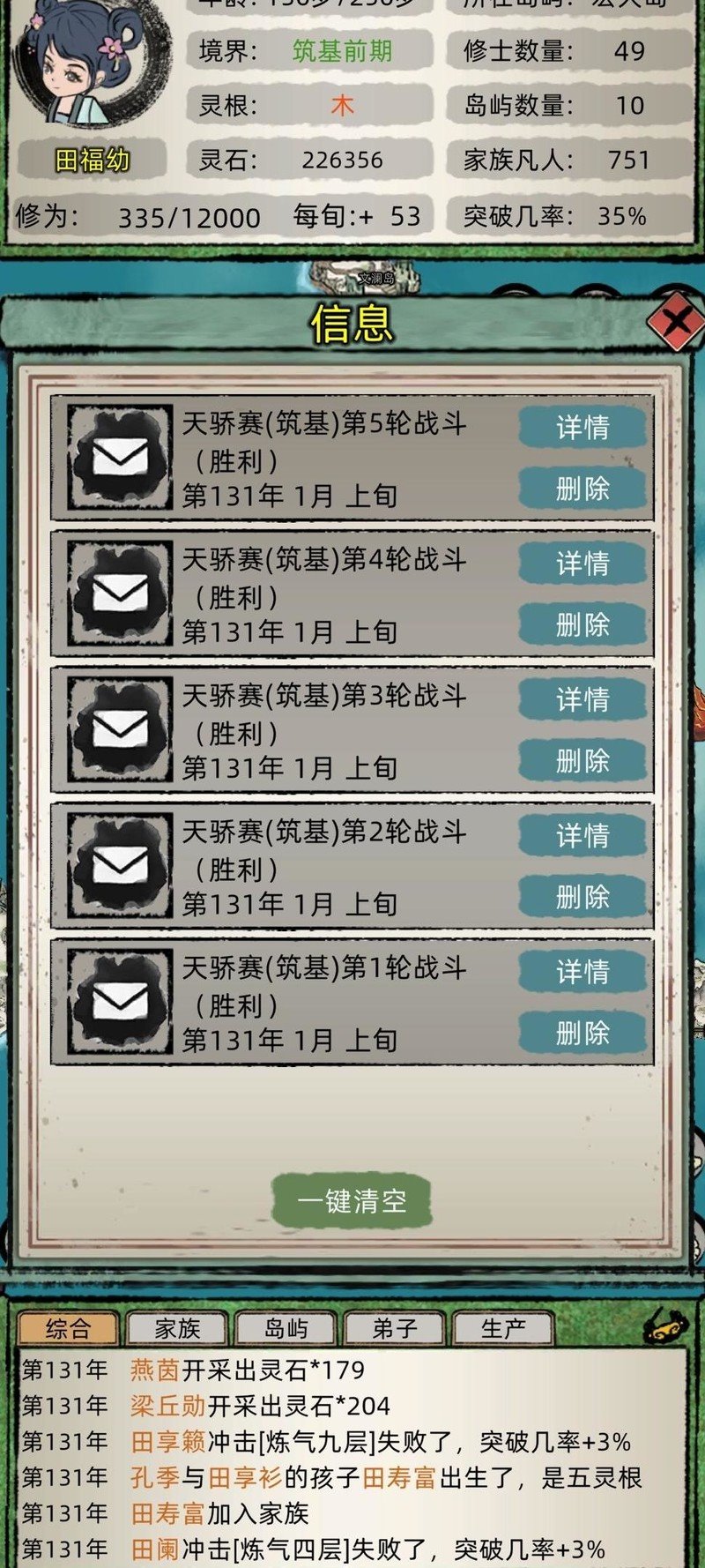 百年筑基,五到七名绿蓝混装弟子可攻占微型岛屿,拆解灵脉后,资质平庸者每岛派驻三人开采灵石矿,所得资源积攒用于为一名主力购置蓝色装备,待其集齐全套蓝装,筑基期中便可稳占优势。