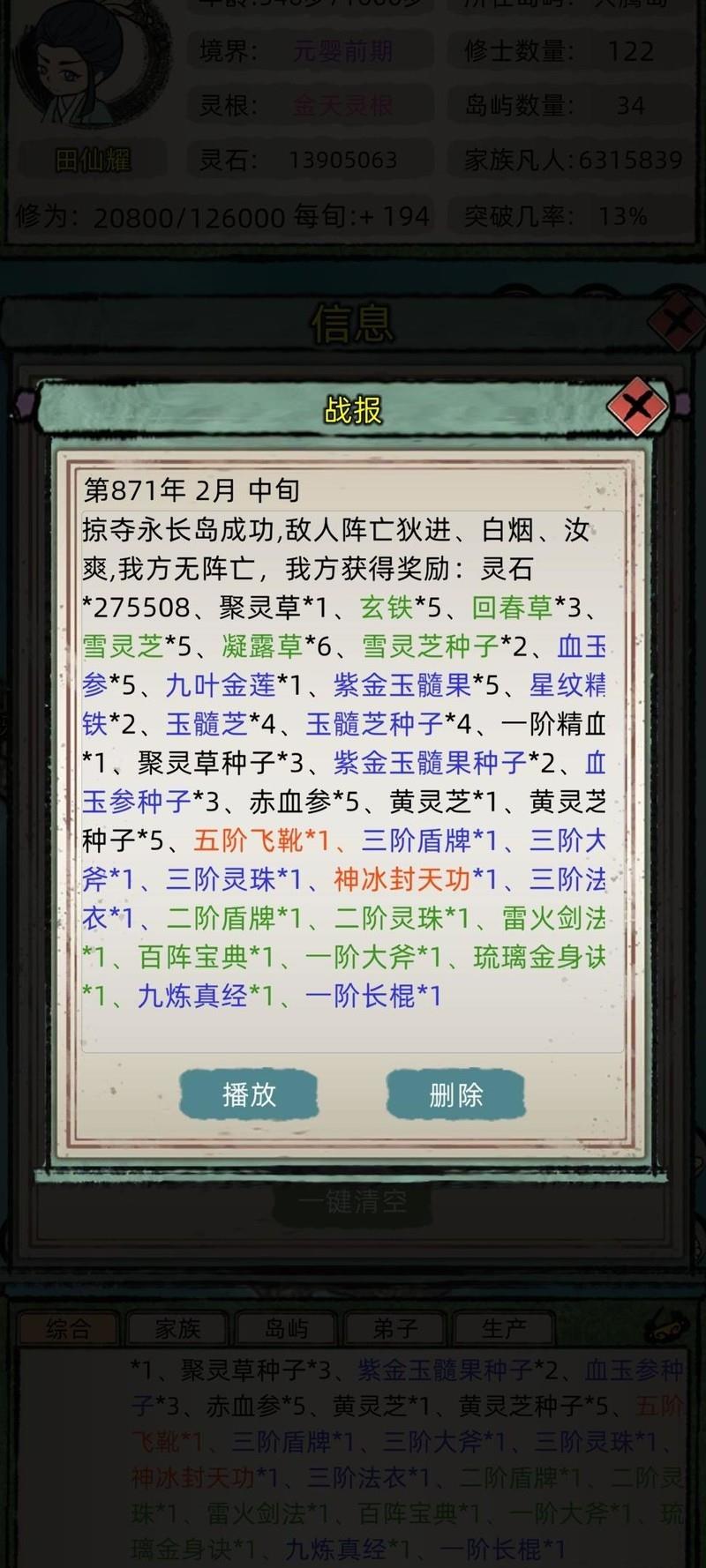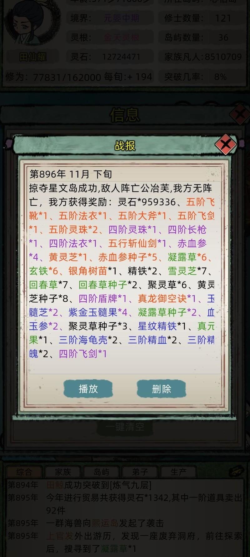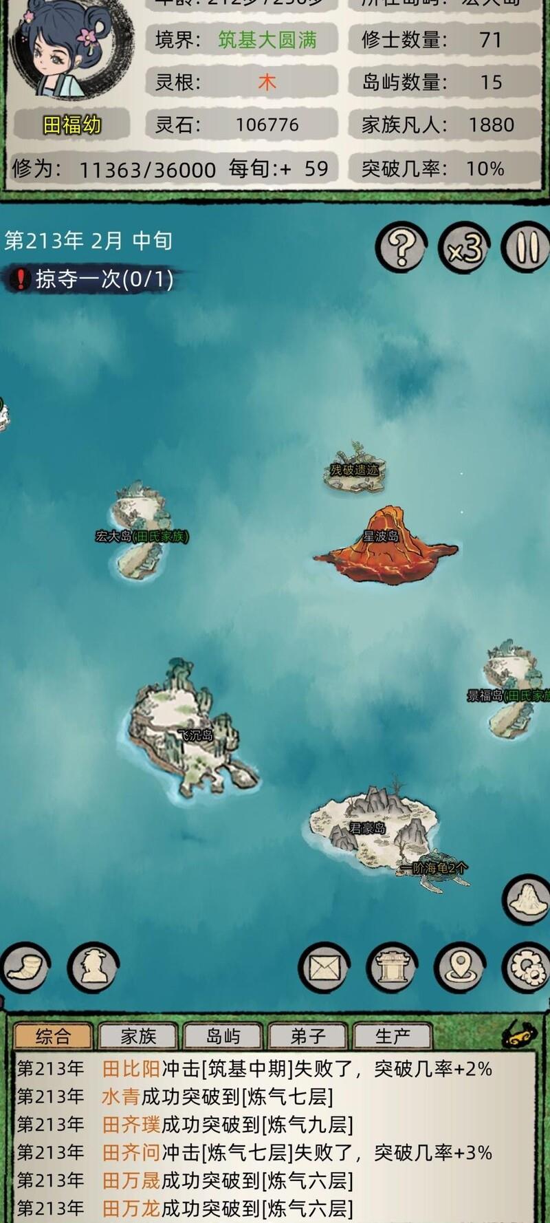 因未及时观看广告,进度落后三百年,只得等待邪宗化神寿终后才悄然行动。期间疯狂搜刮资源,切忌久留占领,得手即迅速撤离,最终占据大型岛屿,安稳发育,逐步提升实力。