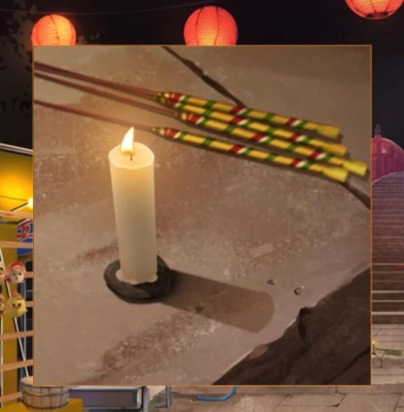 后退可看到女主角,与她对话能推进剧情。继续后退至桥边,发现一名小孩和旁边的蜡烛。用火柴点燃蜡烛后,小孩开始放烟花。观察烟花颜色变化,依次为红、蓝、绿、紫、蓝,需记录下来。