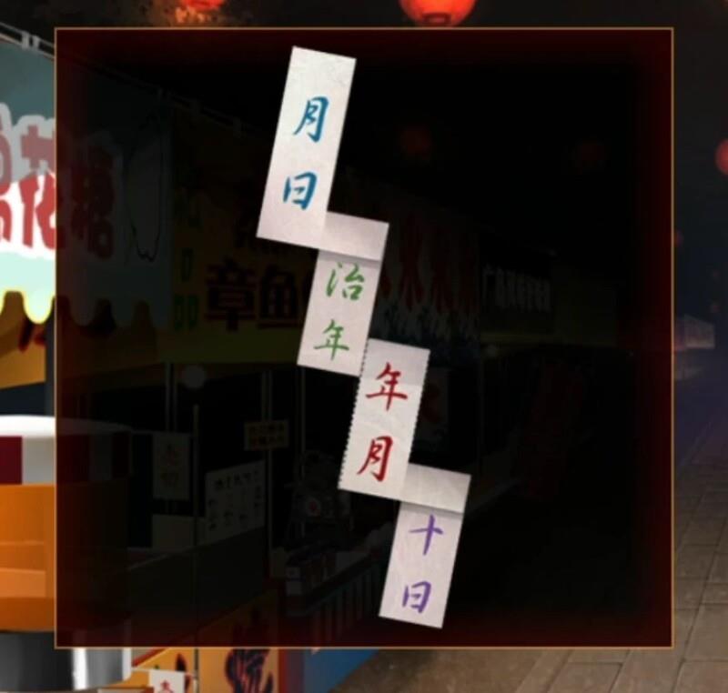 回到刨冰机的场景,观察章鱼烧摊位,对剪刀使用纸条后会自动剪开,得到一个形状奇特的字条。此时需要结合门上的数字进行分析:月和日之间的数字是二十一,可以理解为2 1=3;治和年之间同样是二十一,也视为2 1=3;年和月之间是9,十和日之间是1。再根据纸条的颜色对应数值:蓝色为3,绿色为3,红色为9,紫色为1。