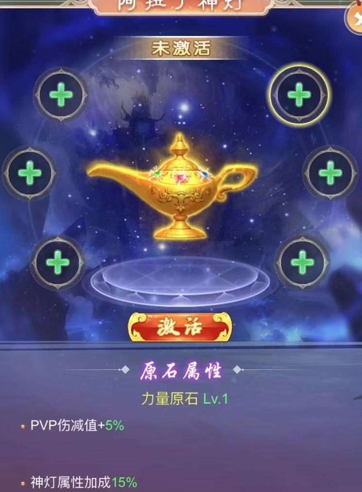 激活神灯并配置原石,可在PVP战斗中为玩家提供伤害减免效果,提升生存能力。