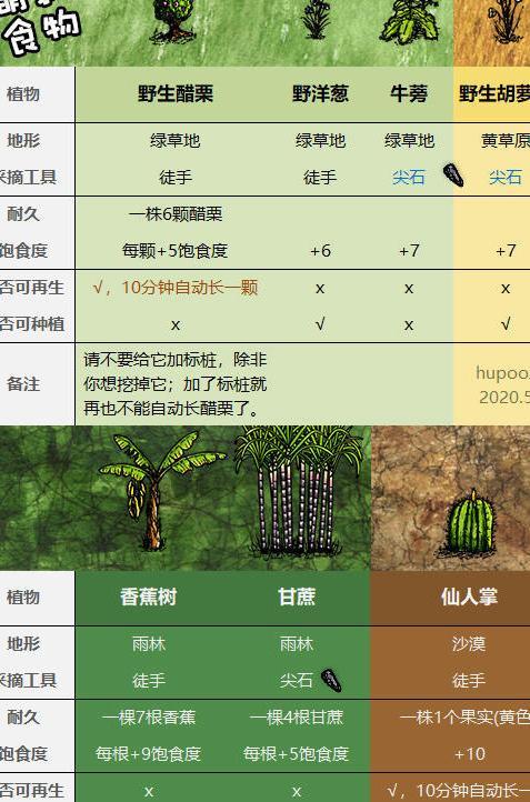 醋栗、胡萝卜和甘蔗可人工种植;野洋葱、牛蒡根与香蕉需在野外采集;仙人掌初次经过时不结果,毒蘑菇则须在绿草地肥沃土壤处用篮子取土后,清掉坑中三条蠕虫并等待才能获取,二者均仅限特定地点获得。