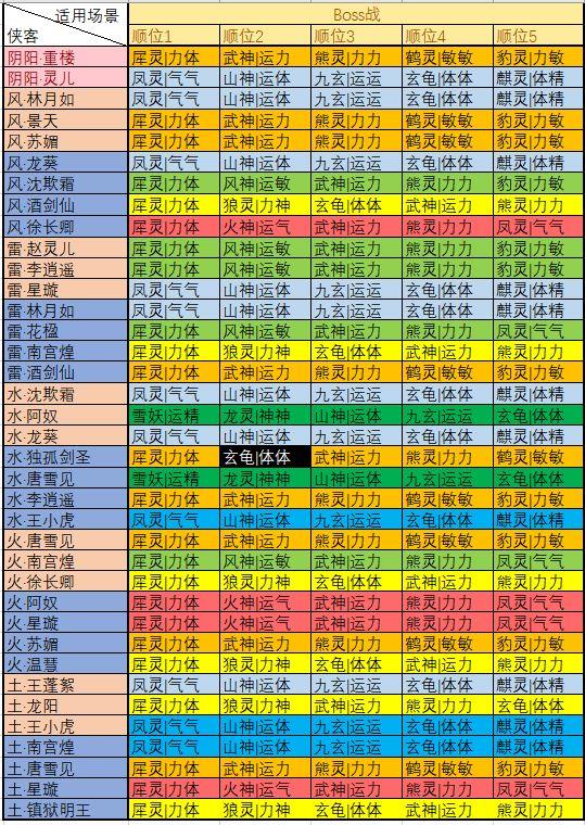 在神祝推荐图中,每位侠客的神祝搭配我都用不同颜色标注,颜色与上方侠客分类一一对应。