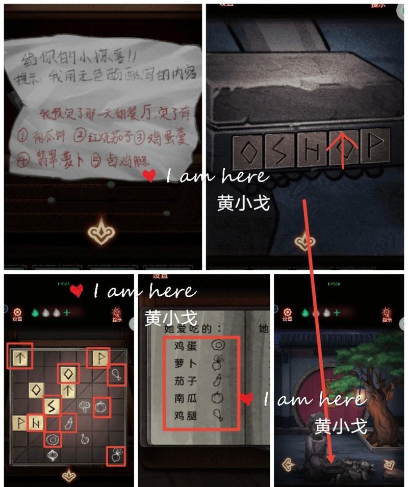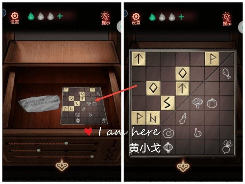 点击石像手中的石盒,参照涂鸦板上的对角线符号、食谱中她喜爱的食物以及纸条上的食物排列顺序,依次调整石盒上的图案:南瓜对应◇,茄子对应s,鸡蛋对应h,萝卜对应,鸡腿对应p。