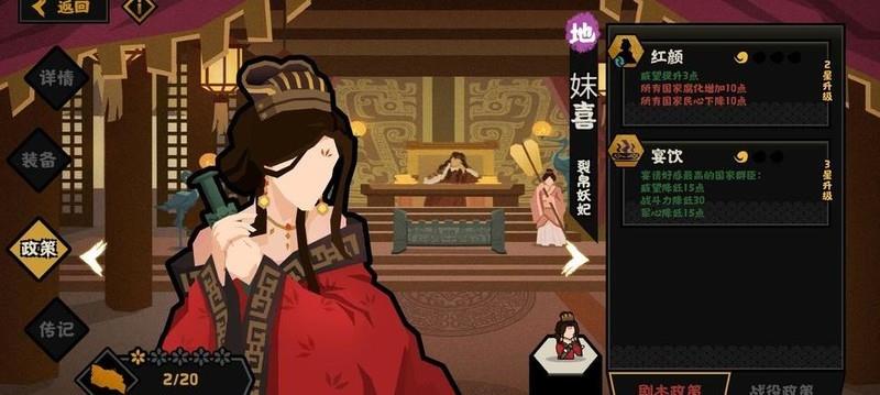 妹喜是当前唯一能全局施加负面属性的英雄,可显著加快游戏节奏。其高腐败值会抑制他国发展,低民心则易引发民变,甚至导致意外亡国。搭配红颜政策时,需每隔半个多小时消耗名士资源进行研发,因此应建造人口类建筑并升级为大学,以提升名士产量,保障持续运作。