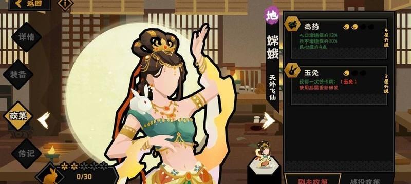 最后登场的是嫦娥,几乎人手必备,氪金玩家可迅速升至满星,技能以战斗辅助为主,加成效果均衡实用。