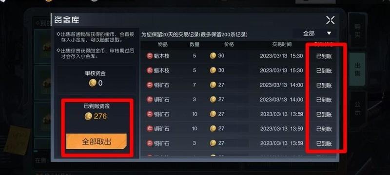 点击交易行左侧的资金库,即可查看已出售物品所得款项。