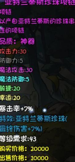 该装备图鉴中为普通紫色品质,拾取后在背包内显示为随机前缀的套装,其套装属性与亚特兰蒂斯套装相近。