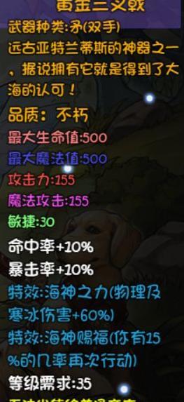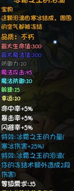 牛顿的苹果是狗铃的自然伤害变体,冰霜之王的泪滴可额外释放两次冻结术,但效果略显鸡肋,实用性不及后期十八层左右Boss掉落的装备。神射护手仅限弓箭职业使用,自身并不提供暴击率加成,需搭配其他属性才能发挥优势。