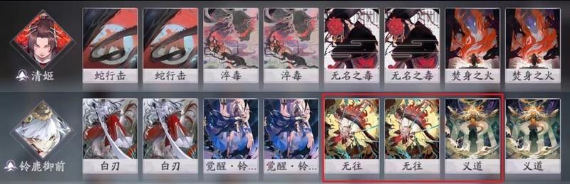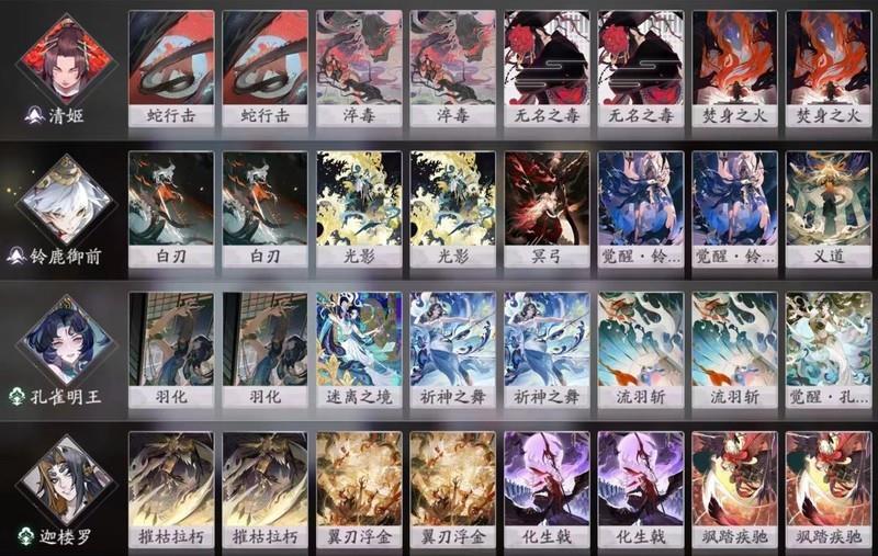 蛇鹿常规配卡需补充2张SR与1张SSR。由于孔雀明王占据瞬发位置,铃鹿御前可不带白刃,改配光影。