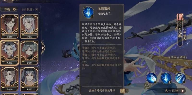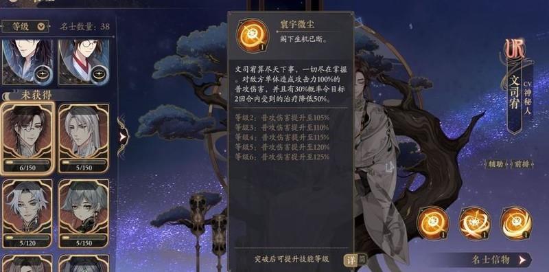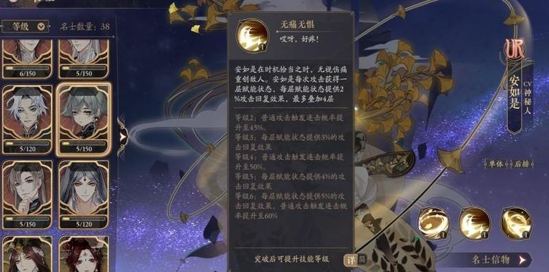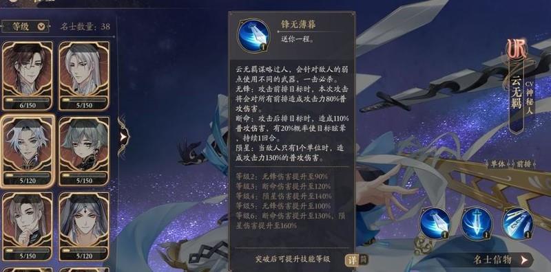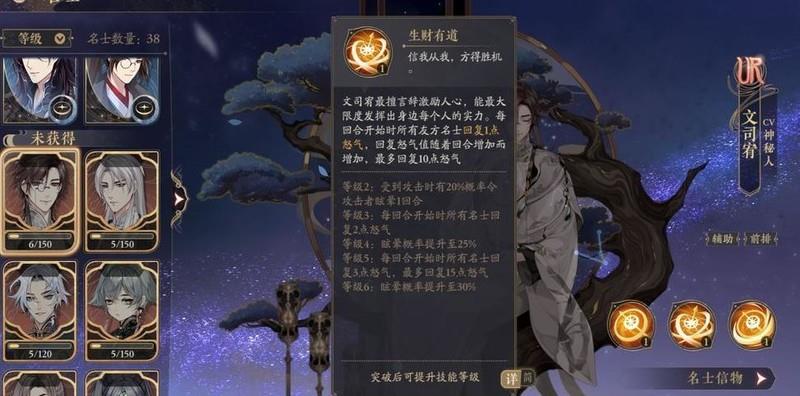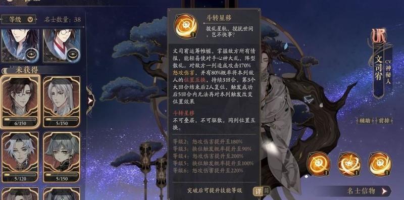 文司宥的大招可交换位置,能显著降低前排主C的回怒速度,高阶技能还可通过承伤赌晕眩,成功控制即为赚取优势。但UR碎片获取难度极高,目前暂不建议培养。