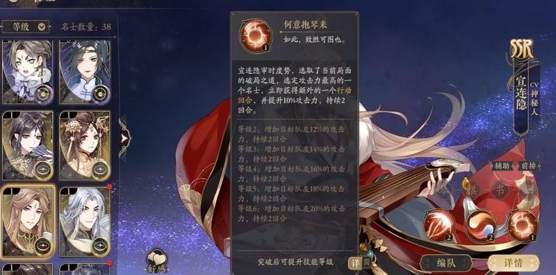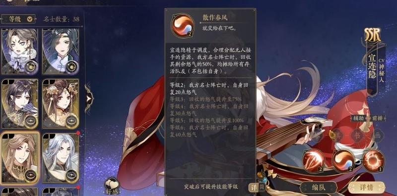 宣连隐是开局必得的辅助,角色翻牌可回收怒气,大招能使主C额外行动一回合。关于其在PVP中的实际表现,欢迎实战过的玩家在评论区补充分享,我尚未使用,不了解具体效果。