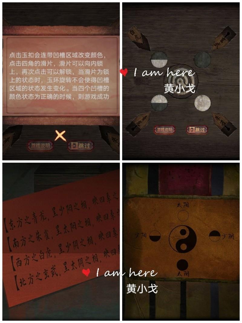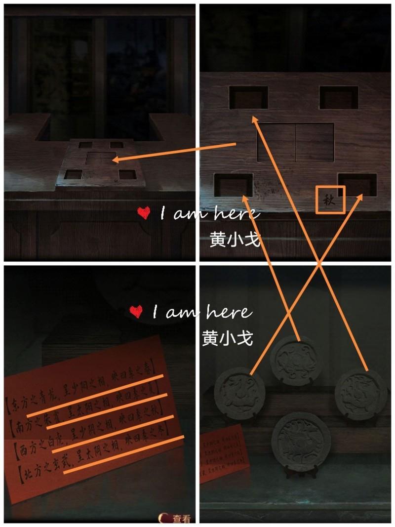 将虎形台印置入秋字凹槽,龟形台印放入白虎旁凹槽,龙形台印置于玄武上方凹槽,朱雀台印放入白虎上方凹槽,触发机关开启暗格,取得玉扣。