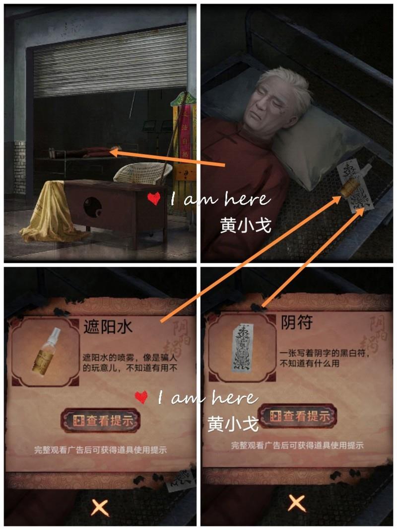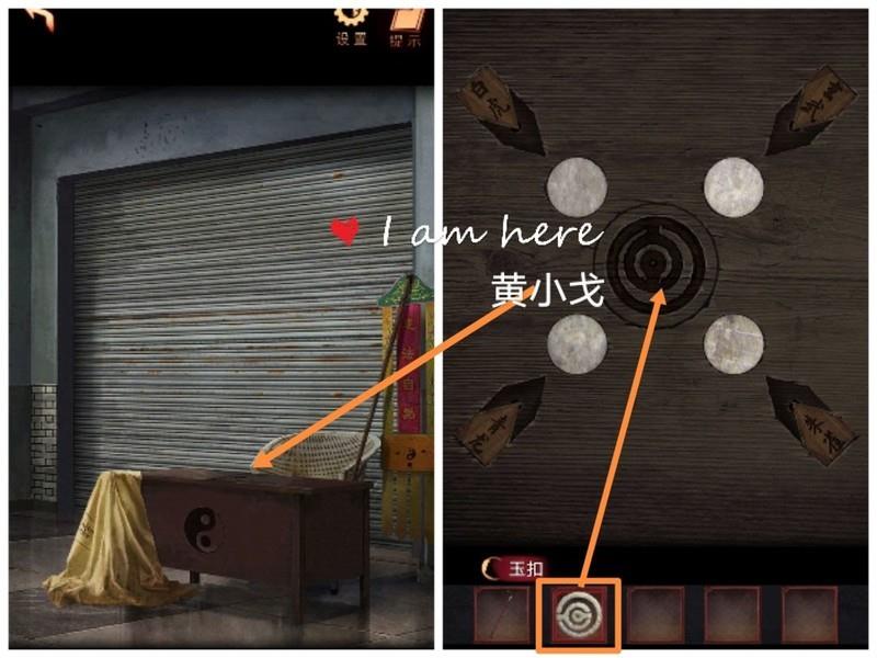 在商场二楼算命摊,拉开布帘,将玉扣放入桌面机关中即可触发后续。