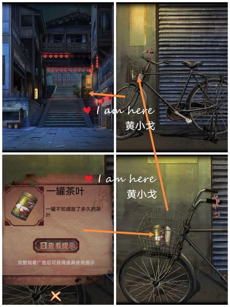 进入巷子,点击自行车,从车篮中取得一罐茶叶。