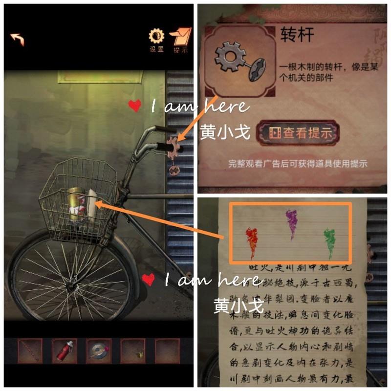 查看纸张内容,注意火焰颜色顺序为红、紫、绿,随后在车把处取得转杆。