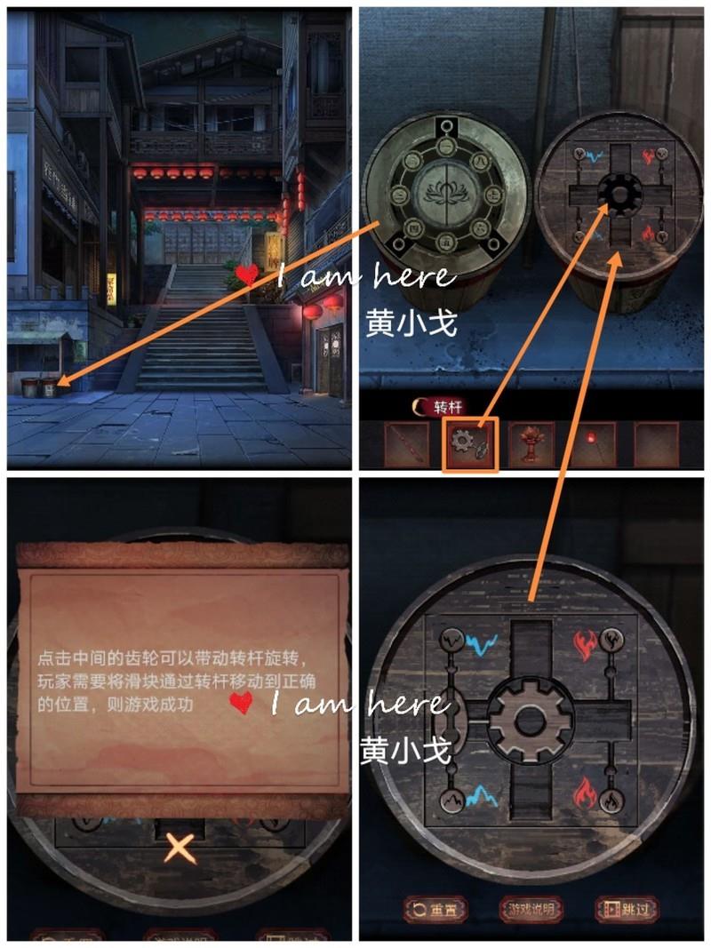 点击墙边摊位,将转杆放入右侧机关盒,查看说明后完成小游戏。