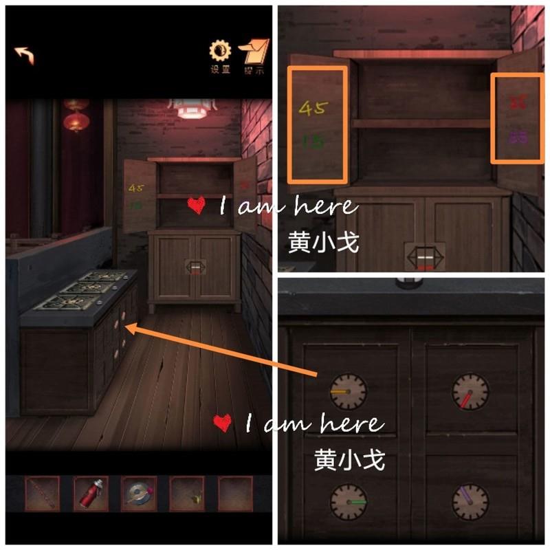 点击茶水间,打开上方柜子,取得与,注意柜门上的颜色数字提示:黄色45、绿色15、红色35、紫色55。