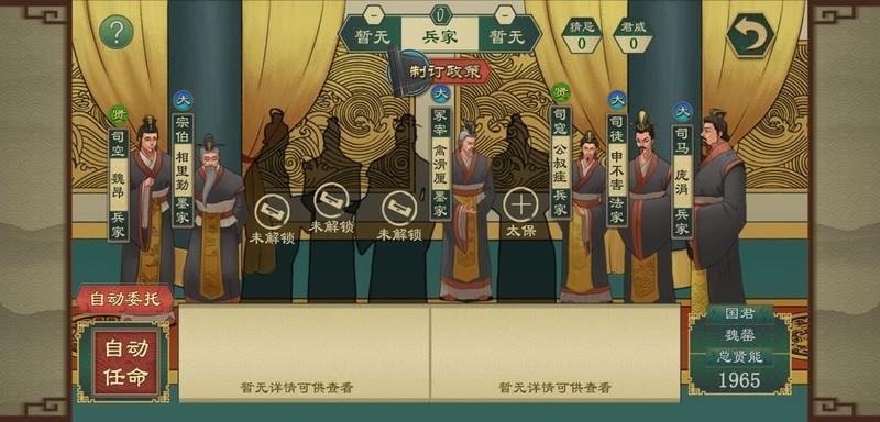 在朝廷中枢,官员的任免至关重要,将合适的人才安排在合适的职位上,才能确保朝局稳固;反之,则可能导致动荡不安。例如鬼谷子这样的纵横家,若强行委派其管理水利,必然难以胜任。游戏初期可使用自动任命功能,后期则建议手动调整以优化配置。系统中设有君威与猜忌机制:君威越高越有利,即便偏低影响也不大;而猜忌过高会削弱国家稳定与君威,应尽量降低。为减少猜忌,推荐任用同一学派的官员,但单一学派难以覆盖所有职位的最优人选。因此,最佳策略是融合三个主要学派,兼顾效率与稳定,实现朝堂和谐与治理高效。