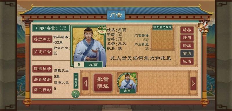 门舍用于管理门客及士子的任免,主要功能包括招募、查看士子属性与技能。通过扩建可提升最多容纳35名士子,亦可通过招贤令突破上限。若无任务安排,士子易流失,需分配事务如读书或出任县令等职以稳定人才。