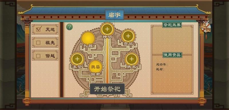 庙宇是太庙祭祀的重要场所,关乎游戏的稳定与正统。建议优先选择阴阳道家进行祭祀,可获得额外加成。天命可通过日常积累获取,无需专门祭祀。当其他两项稳定后,再考虑提升粮食收入的加成效果。