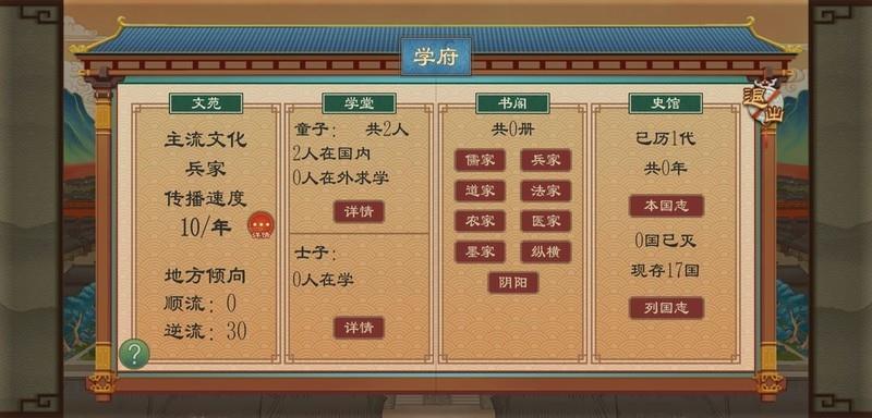 学府主要用于孩童求学,虽成人亦可使用。通常在剧情推进中被要求为童子寻访名师,是培养圣贤的重要场所。可传承已故门客的技艺,兼具多种功能,如展现主流文化传播进度,并在史册中记载各国重大事件。