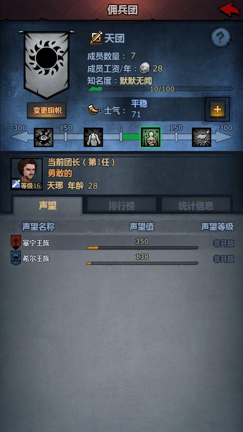 佣兵团士气值在0至150之间时可激活技能,超过150则可免疫濒死恐惧效果。每次战斗胜利增加5点士气,每月等待则减少10点士气。