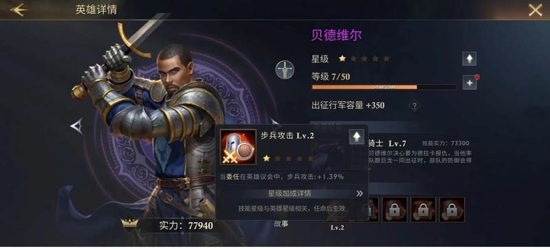 贝德维尔的首个技能步兵攻击是前期核心增益,大幅提升步兵攻击力,轻松应对开局挖矿与清剿野怪,效果直接且高效。