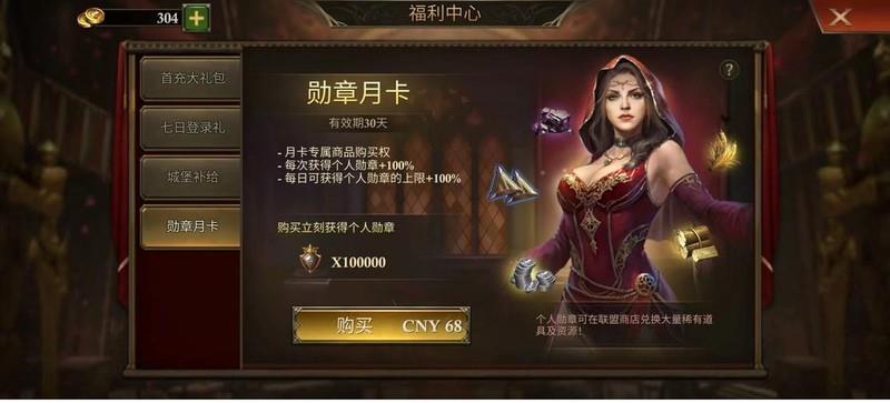 开通月卡后将解锁专属商店,除一次性获得10万勋章外,还可使每次出征占领时个人勋章获取上限提升100%。仅从个人勋章收益来看已十分可观,更不用说用勋章兑换资源所带来的实力增长。