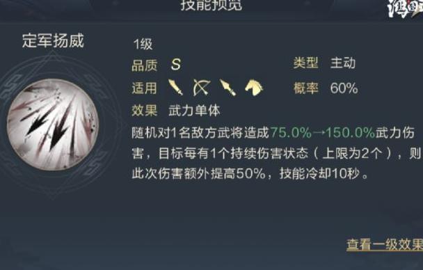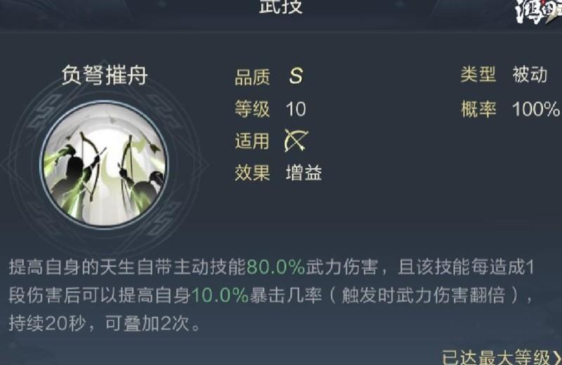 负弩摧舟能提升使用者主动技能80%的武力伤害,每次造成伤害后还可获得20秒暴击率加成,尤其适合高伤害、短冷却的黄忠使用,显著增强其输出能力。