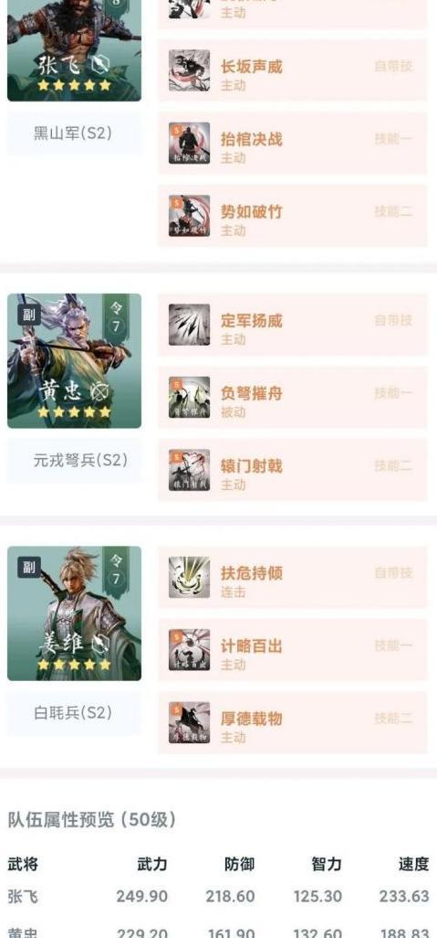该阵容以双核爆发为核心,由经典输出武将张飞担任主将,凭借其自带暴击加成提升输出稳定性。黄忠与姜维联手,借助计略百出强化技能伤害,并通过辕门爆头结合张飞的减防效果打出高额爆发。整体爆发周期短,伤害集中,成型成本低至22令,性价比极高。