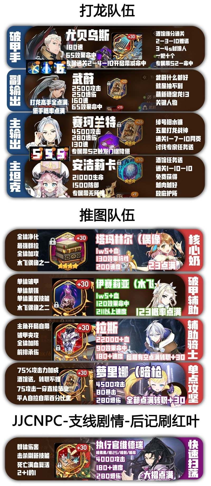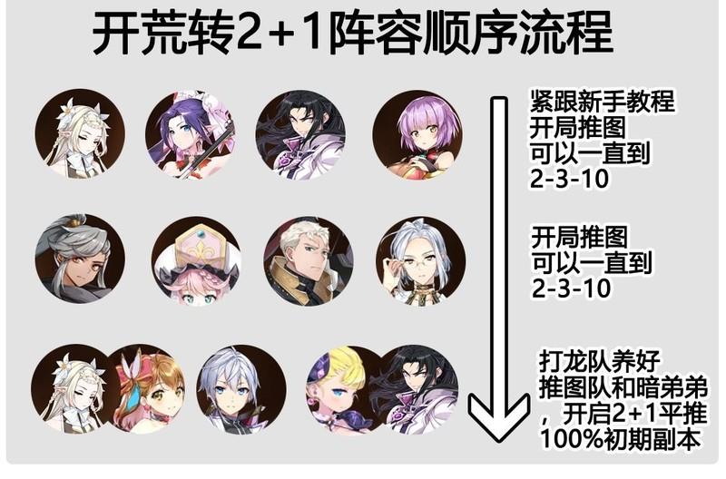 由于部分英雄需要通过抽取或达到一定条件才能获得,因此中期过渡阶段尤为关键。关于过渡期的阵容搭配及关键节点,请参考下图所示内容,继承者大人可根据自身英雄情况和关卡进度灵活调整。