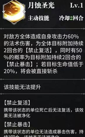 该BOSS的核心输出技能会在玩家行动前率先发动,具备独特机制。虽然伤害较低,但能附加两回合禁止复活与暴击的负面状态,使得暴击与追击类效果作用有限。杨无敌可应对该技能,且通过融合类复活技能可在禁疗期间实现有效复苏,缓解压制效果。