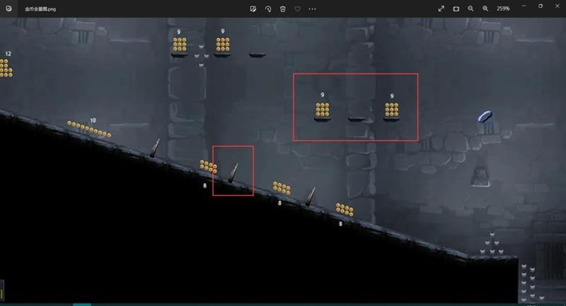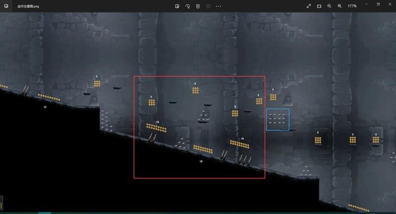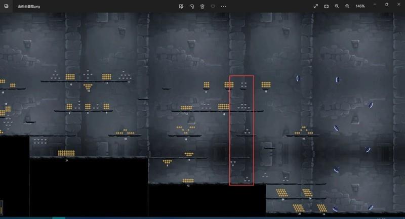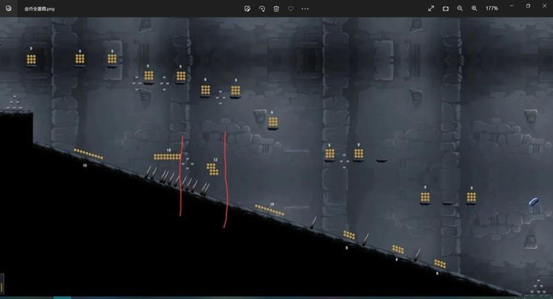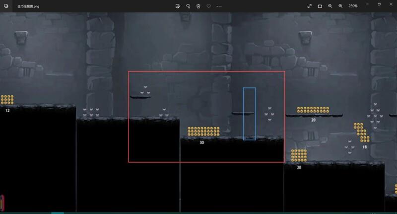 这一段容错空间较大,大致在红色框范围内,不同武器和流派通常都不会失误,具体还需实战验证。吃完两个九宫格后向下移动,开启主手金令剑,利用其效果完整通过后续斜坡区域。