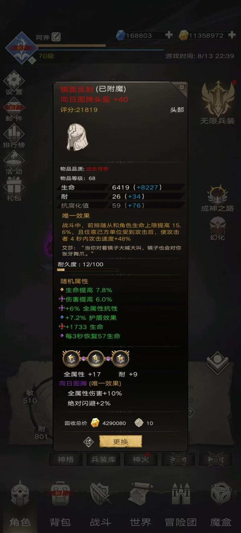 推荐头部装备:头盔,词条选择生命百分比和伤害提升,增强生存与输出能力。