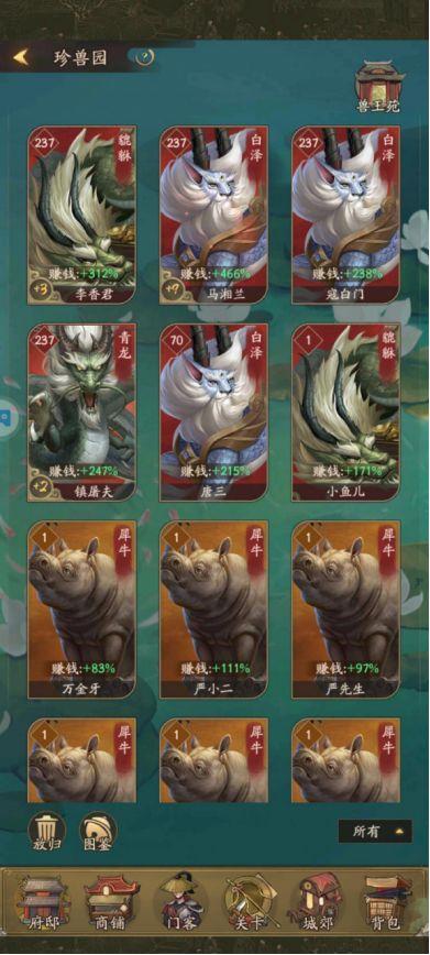 将青龙分配给屠夫,再为严先生觉醒一只无双珍兽。这样马湘兰一旦出现,便可直接替换上阵。青龙的技能尽量刷新至24级以上。对于严先生的珍兽,若没有获得10技能的,先统一刷到22级即可,避免日后获取更强珍兽时因放生而心疼。除青龙和10技能珍兽外,其余无双珍兽只保留一只给主门客,其他全部放生。等当前珍兽养成后,再考虑新增。