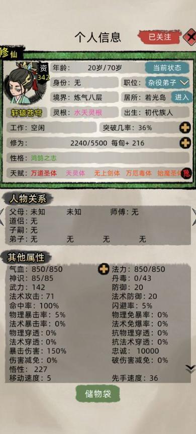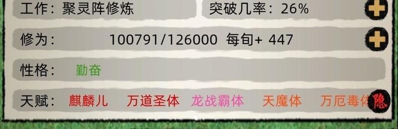 4.4版本更新后,选择红体加天灵根时更容易附带额外天赋,但令人不解的是,在拥有34个天赋的情况下,隐藏体质的触发反而变得更难。尽管如此,只要红体与天灵根组合仍保有约八成概率携带隐藏体质。若不介意此变化,可继续培养,即便后期转为万厄路线,三至五百年内清场重来,也能积累三到四万战力。