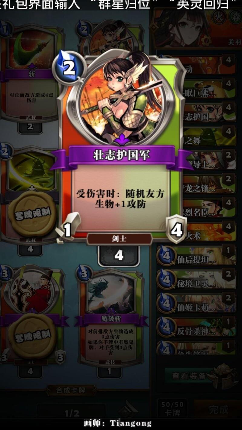 护国军不具备融合能力,因此无法通过融合规避孤注一掷的击杀,但同时也避免了被强化后的护国军彻底清场的风险。2/1/4的身材使其在首回合难以被解掉,无需依赖位移来消耗对手牌手生命,1点伤害影响不大,但其挡刀效果极为划算,能有效保护关键单位。