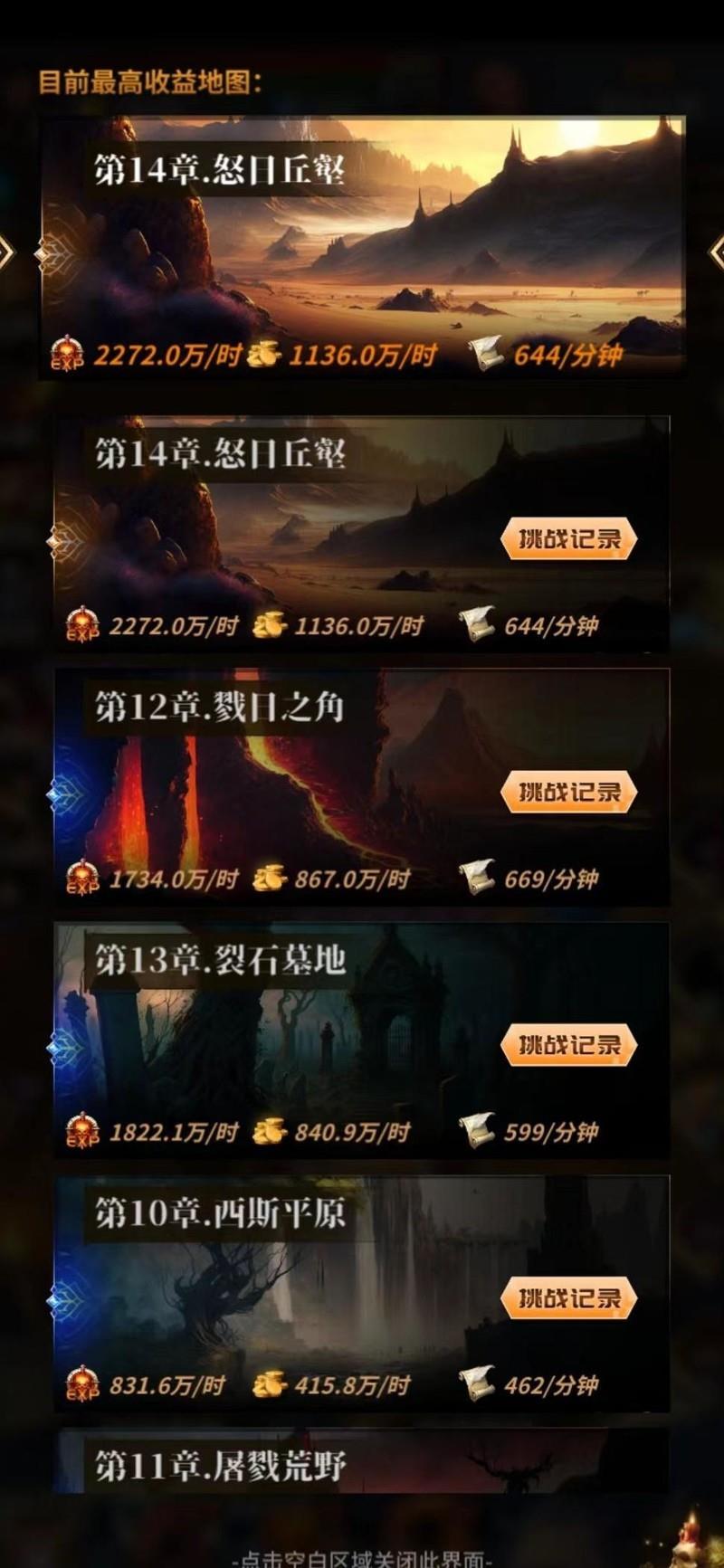 当觉得装备、宝石或技能有所提升时,就前往可挑战的挂机地图刷新个人最佳记录,以获取更高的挂机收益。
