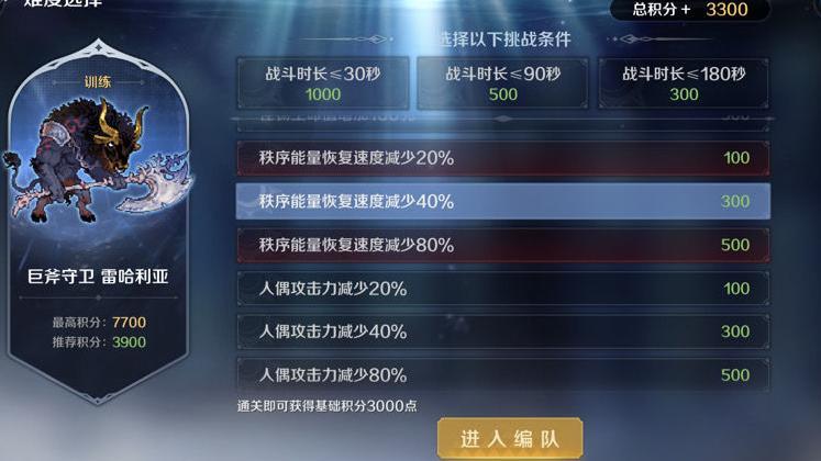 面对强力Boss时,若缺乏高效积累秩序能量的人偶或爆发不足,可果断不选减少秩序能量项,虽损失500分,但通过缩短战斗时间仍能弥补,无需过度担忧整体得分。