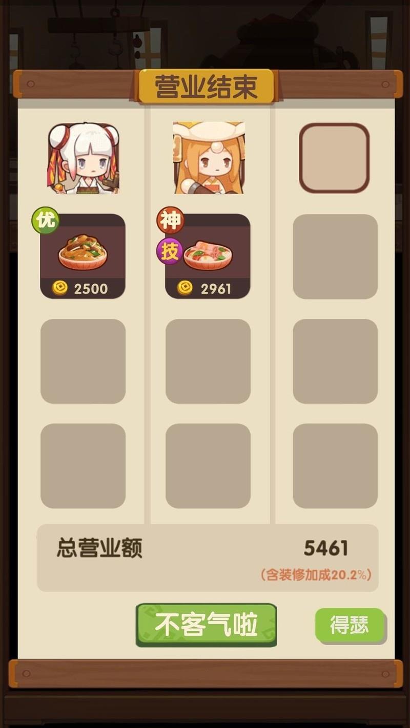 一名2阶满级羽十六厨师(小羽仅能将干炒牛河做到优级别,若有属性更佳的厨师可替换,建议新厨师具备提升稀有客人出现概率的技能或装备)。