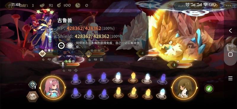 BOSS攻略:这套阵容要求略高,在挑战二阶BOSS前先用白魂清满屏幕,持续释放白2技能,配合华丽暗影赋予绿矮子嘲讽能力,不断触发黑4输出,同时让丽莎持续为全队叠加三层灵巧状态。