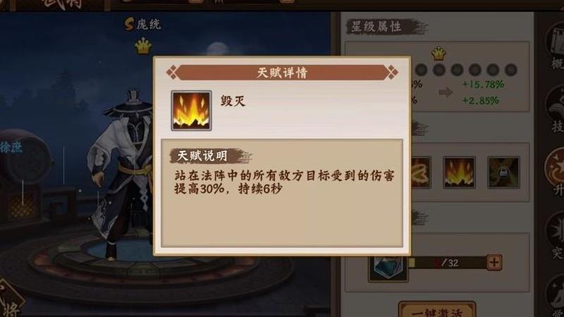 庞统最为核心的技能当属三技能炎天火雨。虽然该技能基础伤害并不突出,但升到一冠后效果质变,实力大幅提升。所有身处法阵范围内的敌人都会额外承受30%的伤害,这一增益极为关键。实战中相当于直接提升三成刷本效率,配合高爆发武将可实现快速清怪。更难得的是,技能持续时间较长,确保输出环境稳定。正因如此,炎天火雨成为副本作战中不可或缺的核心机制,也是庞统在团队中不可替代的重要原因,极大增强了整体输出节奏与战斗流畅性。